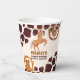 Western first rodeo saddle up horse birthday party personalized paper cups. Brown palomino baby horse, a wheel, rope and cowboy boots, cow pattern, western vintage script.