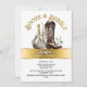 A tooled leather single brown leather cowgirl boot has white floral etchings on it and white summer daisy flowers around it. The boot has a beautiful faux gold and silver bottle of bubbly next to it and a champagne flute set above a faux gold horizontal band edged with a golden trim set against a white background. Editable gold, black and white text templates may be personalised to suit your special celebration. This stylish dowloadable invite is ideal for a western themed, country "boots and bling" or "boots and bubbly" special event too.