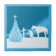 Cowboy praying at cross design in a winter scene on ceramic tile.