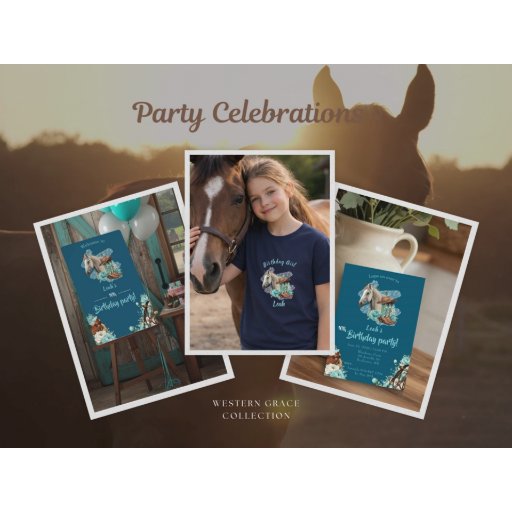 This birthday party banner features a western horse watercolor design with soft floral accents and classic cowgirl elements, including cowgirl boots and a cowgirl hat. The rich navy background paired with turquoise and neutral tones creates an elegant western look that’s perfect for a horse birthday party.