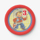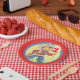 Western themed party plates with a little cowboy swinging a rope. The background is yellow check with a blue and red border.