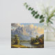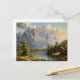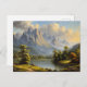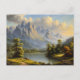 This scene resembles a painting in the style of Alfred Bierstadt, with towering mountains in the background, and a river running through a forest in the foreground. Very nice vintage Western American scene.