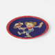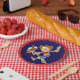 Western themed party plates with a cowboy riding a stick horse on a blue background with red bandanna trim.