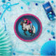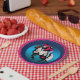 Western themed party plates with a cowgirl mutton buster on a blue background with pink bandanna trim.