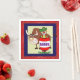 Western party napkins with a rodeo clown inside of a barrel and a bull. Red bandanna print trim.