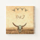 Western rustic wedding bull cow skull beige brown vintage antique style square spiral notebook guest book. Unique old country farmhouse style scenery background. Wild west cowboy inspired design. Four skulls in a pattern with custom name and date script. Initials on back. Trendy, cool, farm animal party supplies. Image copyright Marg Seregelyi Photography.
