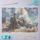 A horrifying moment in the Wild West, where a group of daring outlaws on horseback chase an old locomotive across the desert. The train, billowing white smoke, races along the tracks, its polished brass and red metal gleaming in the sunlight. The outlaws, clad in classic western attire, are in hot pursuit, kicking up dust as they gallop alongside the train. This dynamic scene is set against a backdrop of towering rock formations and sparse greenery, evoking the untamed spirit of the frontier and the legendary tales of train robberies. RHDesigns created decoupage papers for furniture, canvas, poster art and home decor.