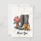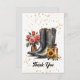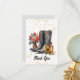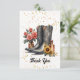 A rustic design featuring tall grey cowboy boots with an amber vase of roses and sunflowers. Abstract dots accent the background of this western style card.