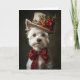 This elegant Christmas card features a West Highland White Terrier dressed in refined Victorian holiday style, complete with a decorative hat, festive greenery, and rich red accents. Inspired by classic portraiture, the design blends quiet charm, warmth, and timeless holiday elegance that Westie lovers instantly recognise.