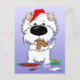 Westie trying to get away with eating all of Santa's cookies. West Highland White Terrier is wearing a Santa Hat, with ginger bread man in his mouth.