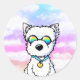 Westie terrier dog art featuring a KiniArt™️ cartoon Westie wearing mirrored sunglasses reflecting the rainbow rage of colours of a sunset sky by Contemporary PUP Artist, Kim Niles. © Kim Niles, KiniArt™️ - All Rights Reserved