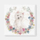 This magnet shows an image of a spring flower wreath in colours of soft pink, blue, gold, green and cream. At the centre is a beautiful watercolor portrait of an adorable West Highland White Terrier. Tiny gold confetti adds interest to the background. Perfect for anyone who loves a Westie!