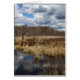 A dramatic sky reflects in the still water with wetland plants and trees.