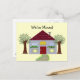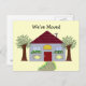 A cosy house with blue siding and a deep red roof. Window boxes and grown trees flank either side. A lovely stone pathway leads to the red door. Customise with all of your new mailing information as desired.