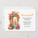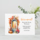 This watercolor moving home announcement features a rustic door surrounded by leaves and pumpkins. This is perfect for autumn fall.