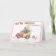Cartoon greeting card for moving house. Illustration of truck piled high with furniture and dog running behind.