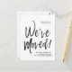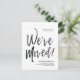 A minimal black and white script-style moving announcement postcard. It features a large script text of the words "We've Moved" followed by your address information below it. Many individual elements of the invite card are unlocked so feel free to change or add any details necessary by using the customisation function.