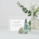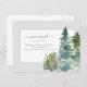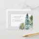 This design features watercolor pine trees and custom script calligraphy on a simple background.