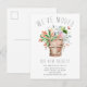 Rustic moving announcement post card featuring a country clay pot with pretty spring flowers.