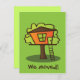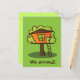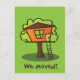 This postcard features a cute and funny design of a treehouse. The colours are orange, green and brown.