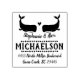A whimsical couple of whales are floating at the top of this address stamp. Below are your first names arched under the whales and your last name surrounded by a bubble border and your address, all in pretty handwritten style fonts. Perfect for stamping your wedding stationery or as a gift for newlywed or engaged couples or just any one who loves whales!