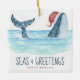Nautical theme coastal Christmas ornament features a watercolor whale wearing a Santa hat swimming in the sea with string lights decorating its tail and a "Seas & Greetings" caption (both lines of text can be personalised). Visit my "Whale Santa Seas & Greetings" collection for coordinating Christmas cards, Christmas party invitations, stickers, gift tags, decor and party supplies. Art by KL Stock