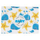 Adorable baby pattern featuring blue whale cartoons and yellow colour sea stars with a round badge and a baby name monogram.