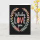 This greeting card centers on the sweet phrase “Whaley LOVE you,” arranged to feel like a little inside joke between close hearts 🥰. “Whaley” and “you” appear in smooth, flowing lettering, while the “L” and “E” in “LOVE” use a crisp, simple style that makes the middle stand out. The “OV” is colored coral-red and sprinkled with tiny white hearts, giving the message a soft, affectionate sparkle ❤️. A stylized laurel wreath wraps around the words, like a gentle hug framing the note. The leaves shift through muted peach, blush, sage, and warm ochre tones, each dotted with small white speckles that add a cozy, textured look. Everything sits on a deep, velvety black background that makes the warm colors and white accents pop. The coral “OV” sits at the center of “LOVE,” with the wreath forming an oval border around the text and the little white hearts clustered across the red letters.