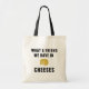 Cheese is your friend! And there's no better way to do your cheese shopping than with our funny, retro-style tote. Design features "What a Friend We Have in Cheeses" in black block text with a wheel of cheese illustration.