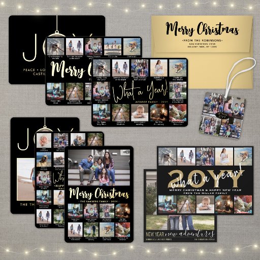 What a year to remember! Send stylish joyful greetings and share 18 favorite pictures with a 5x7 photo collage holiday card. Create your own unique year in review card for family and friends to enjoy. All pictures and wording on this template are simple to personalize. The colors and font styles can be customized with the Zazzle Design Editor tool. The black, gold and white design features trendy casual handwritten script, elegant classic typography name and year, and a modern photo grid with 18 square pictures and typewriter font captions. The message on back is easy to personalize or delete. Family and friends will love displaying this stylish customized card. Please note that the gold is printed color, not metallic foil. Happy Holidays!