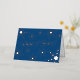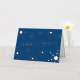 Stylish holiday card features "What A Year!" in a large silver handwritten script font surrounded by shiny geometric silver snowflakes in various sizes on a blue background. Easily customise the message and name(s) inside in the sidebar. You can delete the text inside if you prefer to write your cards by hand.