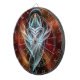 Just Below Is A Copper Gold Pedestal Structure With Fiery Clouds In The Background And A Colourful Rock Formation In The Foreground Of Blue, Violet, Green And Orange Colours.