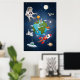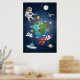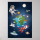 What’s happening around planet earth, a view from space. Poster image with rocket, astronaut, satellite, moon, etc…