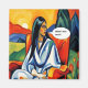 A woman in a white and blue dress sits on an orange chair within a landscape of vibrant hills and a bright sun, wondering 'What's that smell!'