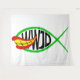 A parody design of the Ichthys (Jesus Fish). The design of the Ichthys fish, mashed up with the Joker Fish from a comic book cartoon. WWJD in black text is inside the fishing, asking, "What Would Joker Do?"