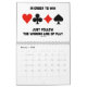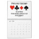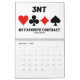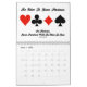 Showcase your wry bridge / duplicate bridge attitude throughout 2014 with this bridge calendar featuring 13 bridge sayings -- one for each month and a bonus design on the back of the calendar which expresses "What You Hear At The Bridge Table".
