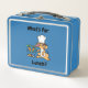 A cute Rabbit cooking up some carrots on the stove. Wording Asks "What's for lunch"? Customise the back of the lunchbox and the colour which is now blue.