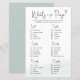 What's in your Purse Bridal Shower Game. Simple and fun game where guests try and get the most points to win. "What's in your Purse" title stands out in hand lettered calligraphy with casual elegance. Chic minimalist design with black and white typography on a white background finished, with a gentle watercolor wash and soft green colour palette on the reverse. Simple modern and elegant design to co-ordinate with many bridal shower themes. Please browse my collection for matching items or message me to create the templates you need.