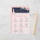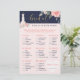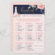 An elegant, stylish and trendy floral rose garden bridal shower what's in your purse bridal shower game. The design features our hand-painted chic, elegant and modern sheer white and pale blush pink wedding dress gown with a botanical garden of blooming roses and florals. The floral dress is hanging on an ornate vintage style faux gold dress hanger. Soft flower lace details and sparkling emblements on the wedding dress create a beautiful, sophisticated, and luxurious look. A beautiful script style handwriting typography "Bridal" in gold. The navy blue, blush pink, and faux gold colour palette creates a trendy, shabby chic, and vintage style look. Watercolor floral roses frame the top. The reverse side features a minimalistic blush pale pink background with a gold heart pattern that beautifully complements the front artwork. Hand-drawn original artwork by Moodthology.