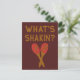 This retro style design has an illustration of a pair of maracas along with the slogan What's Shakin? The graphic and lettering have a lightly distressed style for a vintage look. The graphic is red and light brown with lettering in light brown set against a maroon background. The back of the postcard is blank for you to write in your own message.