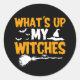 This design features orange and white text "What's up my witches" in popular typography with bats, a witches hat, broomstick and spider as decoration. Perfect Halloween gift.