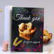 Express your gratitude with rustic farm elegance through this wheat-inspired thank you card. The front cover features a rich shiny black background with a light golden wheat sprig in the bottom left corner. At the centre, a customisable photo space displays a warm of freshly baked bread, framed with a delicate vine border in light green, red, and soft purple tones. Inside, the left panel can hold a personal farm photo or illustration, while the right panel is reserved for your heartfelt customisable thank you message. The back continues the rustic theme with simple wheat details, making this folded card a perfect choice for homesteaders, bakers, farmers’ market sellers, and anyone who loves sharing gratitude with a touch of country charm.