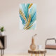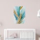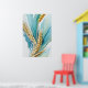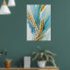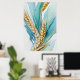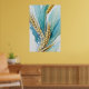 This watercolor print features a detailed stalk of wheat on a teal blue-green watercolor highlighted background. This unframed print is available in various sizes to fit standard frames.