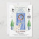 Announce your new address with our stylish announcement featuring a Wheaten Terrier, blue front door, welcome mat, slate sign, topiaries and a floral wreath set on a grey brick background.