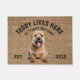 Wheaten Terrier Personalised Dog lover welcome doormat. This welcome mat can be personalised with your dog’s name, the slogan can also be changed or you could use a picture of your own dog (make sure it's transparent).  Text reads: Teddy lives here…. All treats welcome