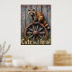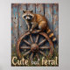 This unique painting captures a racoon with its curious gaze fixed forward, sitting on an old, weathered wooden wagon wheel. The wheel rests against a textured wooden wall. Grasses and other plants sprout up around the base of the wheel. The phrase "Cute but but feral" is prominently displayed in a playful yellow font at the bottom.