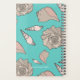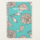Illustrated seashells custom planner. Tropical turquoise background with beige and pink shell pattern on front and back. Use the template to add your title, with a name, or family name, and year. Inside, pages are set up with grids for year long organizing. The design is hand drawn and featured the beautiful knobbed whelk shell along with little turret shells.