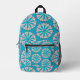 Aqua blue backpack with whelk shells design. The lovely lightning whelk shell forms circular designs and is patterned over a sea blue colour. This sea themed pack is perfect for kids or adults who appreciate the ocean and it's seashell dwelling creatures.