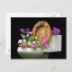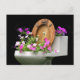 Humourous photo postcard. When life gives you poop make fertilizer. Cheer up, recycle etc. Petunias growing in an old toilet