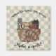 Country primitive style basket filled with country whimsy's. Caption reads "When life hands you scraps, Make a quilt!"